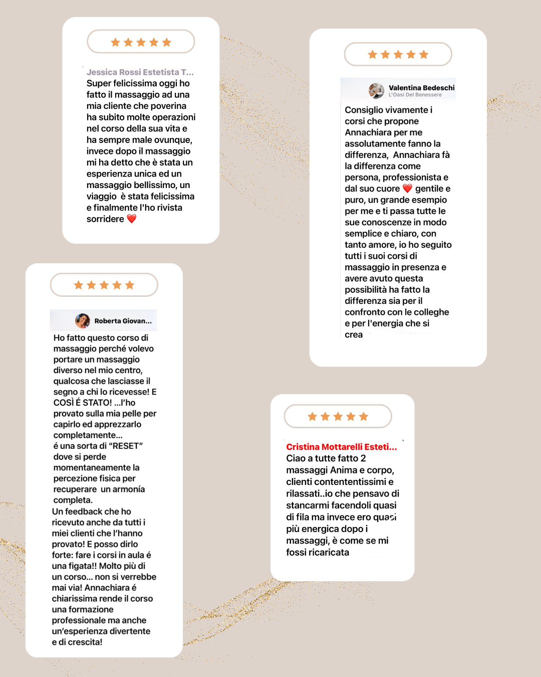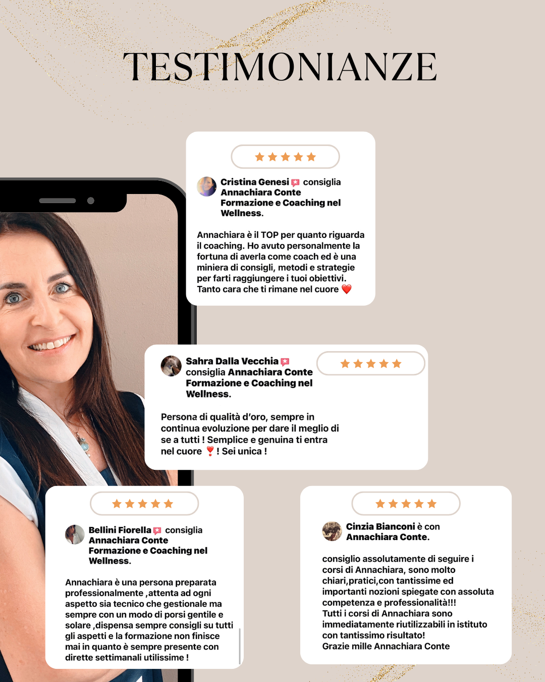 Sono Annachiara Conte, Trainer, Coach e Consulente nel settore Wellness e Beauty con oltre 20 anni di esperienza. Ho lavorato a fianco di centri benessere di alto livello, aiutando professionisti e strutture a migliorare i loro servizi e a raggiungere il massimo potenziale.