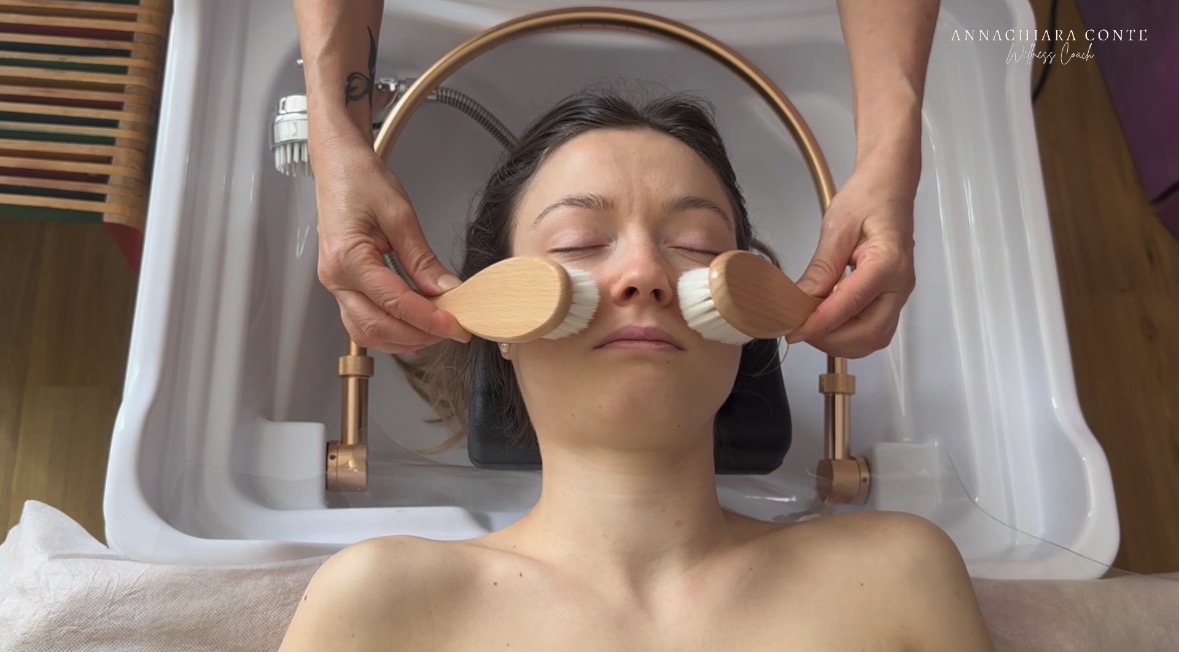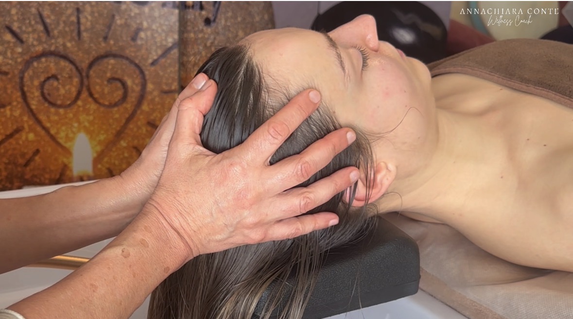 Il cuore del metodo. Massaggio viso, cuoio capelluto, collo, spalle, eventuale corpo, manualità lente, ritmo, profondità.